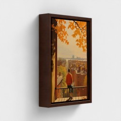 Tableau imprimé art sur toile encadrée illustration Vue urbaine au crépuscule homme regarde sur les toits couleurs d'automne